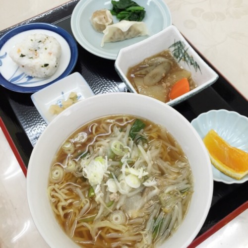 メニューは、あんかけラーメン、餃子、シュウマイ、大根とごぼうの煮物、ミニおにぎり、漬物、オレンジです!
