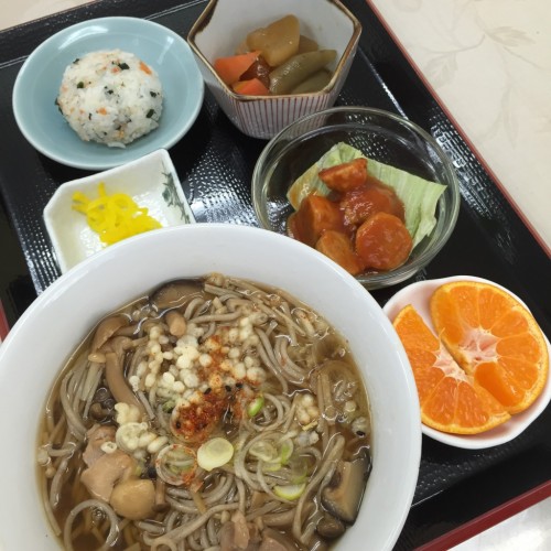 メニューは、きのこそば、大根の煮物、ミートボール、ミニおにぎり、漬物、みかんです!