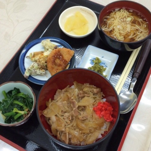 メニューは、豚丼、さつまいもの天ぷら、メンチカツ、ほうれん草のホタテ和え、味噌汁、漬物、パインです!