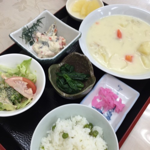 メニューは、シチュー、人参の白和え、ブロッコリーとトマトのサラダ、ほうれん草のお浸し、ご飯、味噌汁、漬物、パインです!