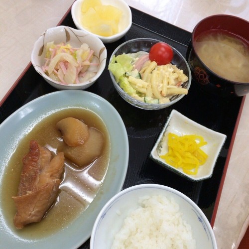 メニューは、赤魚の煮付け、マカロニサラダ、白菜のナムル、ごはん、味噌汁、漬物、パインです!