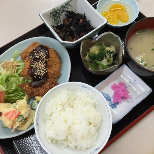 メニューは、みそカツ、ひじきの煮物、ほうれん草とキャベツの煮浸し、ごはん、味噌汁、漬物、みかんです!