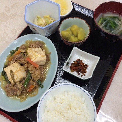 メニューは、肉豆腐、白菜としめじの和え物、さつまいもの甘煮、ごはん、味噌汁、漬物、パインです!
