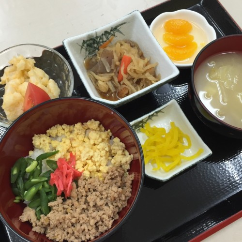 メニューは、三色丼、切り干し大根の煮物、カリフラワーとトマトのサラダ、味噌汁、漬物、みかんです!