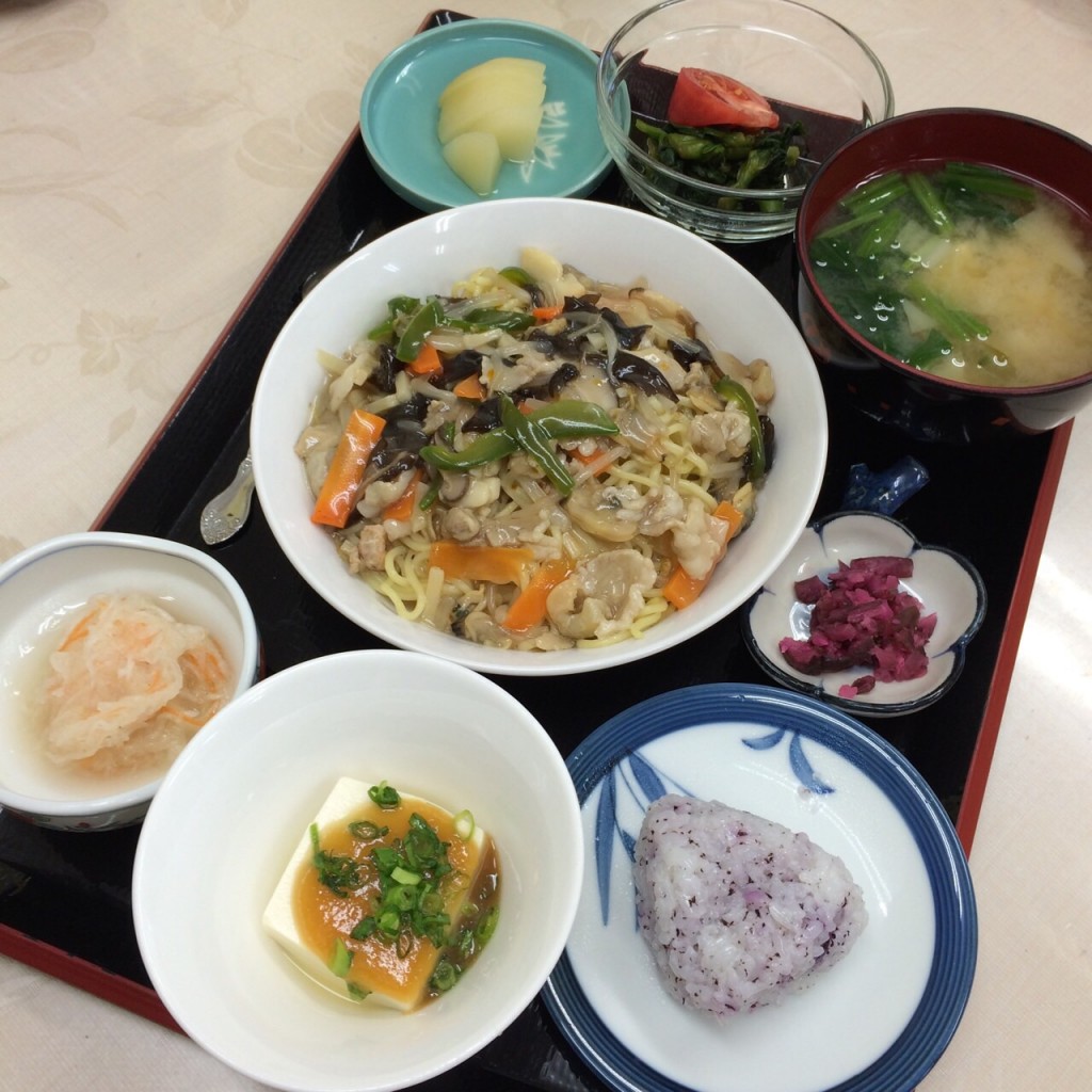 メニューは、あんかけ焼きそば、とうふの田楽味噌、もやしとわかめの和え物、だいこんとにんじんの甘酢和え、ミニおにぎり、漬物、ももです!