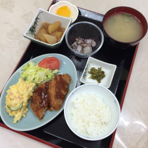 メニューは、メンチカツ、マカロニサラダ、だいこんのべっこう煮、白菜のゆかり和え、ごはん、味噌汁、漬物、ももです!