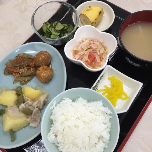 メニューは、塩肉じゃが、きんぴら炒め、肉団子、きゅうりの昆布和え、トマトと玉ねぎのサラダ、ごはん、味噌汁、漬物、バナナです!