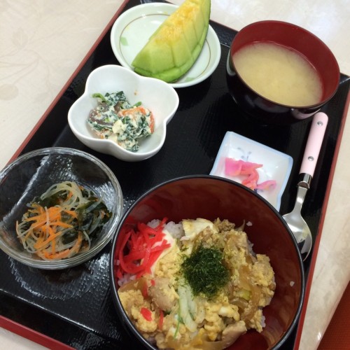 メニューは、親子丼、ほうれん草の白和え、わかめと玉ねぎのおかか和え、味噌汁、漬物、メロンです!
