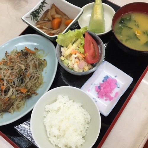 メニューは、春雨の炒め物、さつま揚げの煮物、マカロニサラダ、ごはん、味噌汁、漬物、メロンです!