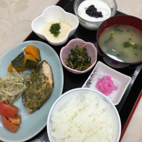 2015/6/25 2015.06.25 昼食 本日の昼食です! メニューは、魚のねぎ味噌焼き、ほうれん草の胡麻和え、とろろ、ごはん、味噌汁、漬物、ブルーベリーヨーグルトです! 今回の魚のねぎ味噌焼きは新メニューです! また、ブルーベリーヨーグルトのブルーベリージャムは、手作りのジャムを使用しています♪