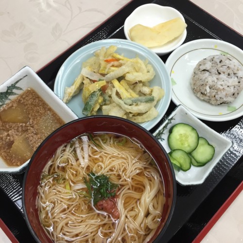 メニューは、梅そうめん、かき揚げ天、だいこんのべっこう煮、ミニおにぎり、漬物、りんごです!