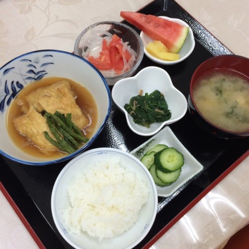 メニューは、油揚げのきんちゃく煮、ほうれん草のなめたけ和え、玉ねぎとトマトの酢の物、ごはん、味噌汁、漬物、スイカです!