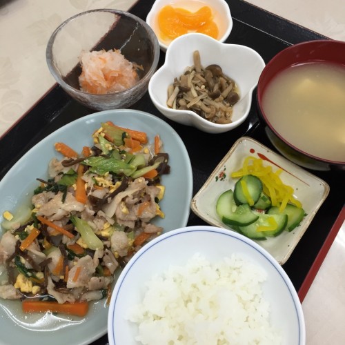 メニューは、豚肉ときくらげの卵炒め、きのこのしぐれ煮、大根なます、ごはん、味噌汁、漬物、みかんです!