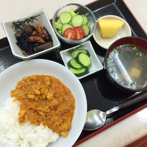 メニューは、チキンカレー、生野菜、ひじきの煮物、スープ、漬物、バナナです!