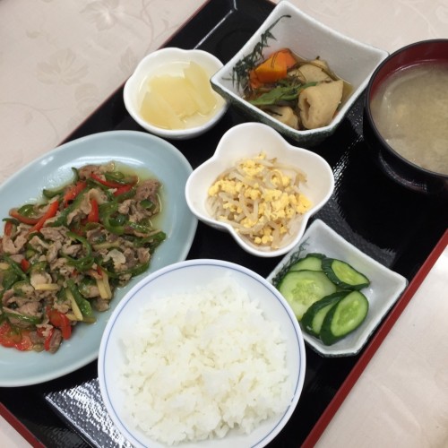メニューは、チンジャオロース、もやしのナムル、切り昆布の煮物、ごはん、味噌汁、漬物、ももです!