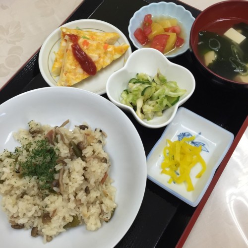 メニューは、ピラフ、オムレツ、キャベツと塩昆布の和え物、わかめスープ、漬物、パインです!