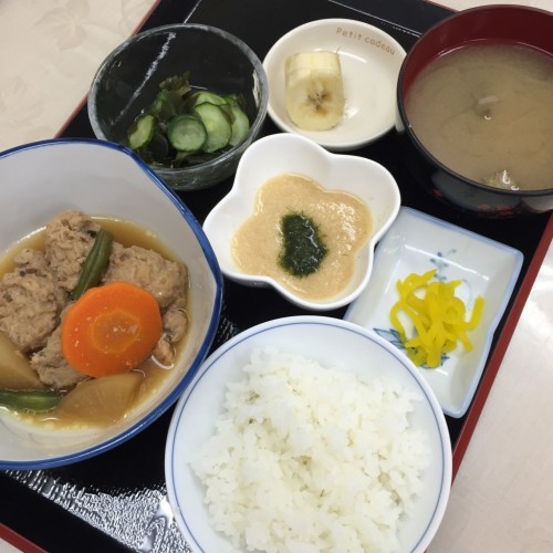 メニューは、豆腐つくねの煮物、きゅうりとわかめの酢の物、とろろ、ごはん、味噌汁、漬物、バナナです!