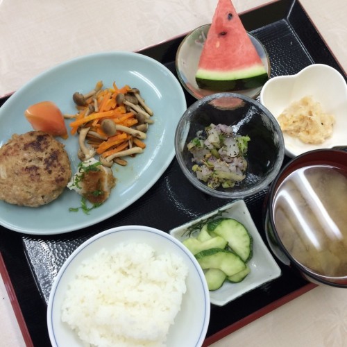 メニューは、和風ハンバーグ、白菜のゆかり和え、大根のピーナツ和え、ごはん、味噌汁、漬物、すいかです!