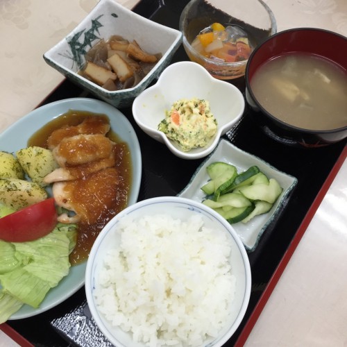 メニューは、鶏肉のソテー、ブロッコリーのサラダ、こんにゃくの煮物、ごはん、味噌汁、漬物、ミックスフルーツです!