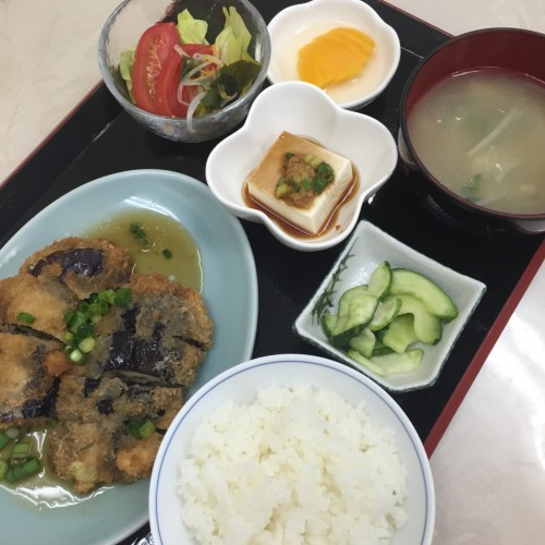 メニューは、なすのはさみ揚げ、トマトとわかめのサラダ、冷奴、ごはん、味噌汁、漬物、ももです!