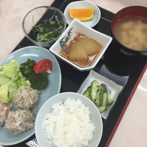 メニューは、焼売、わかめのナムル、冬瓜のそぼろあんかけ、ごはん、味噌汁、漬物、オレンジです!