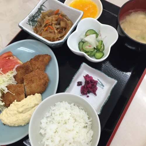 メニューは、魚のフライ タルタルソース、切干大根の煮物、きゅうりの和え物、ごはん、味噌汁、漬物、みかんです!