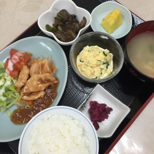 メニューは、冷鶏の梅和え、なすの炒め物、卵サラダ、ごはん、味噌汁、漬物、パインです!