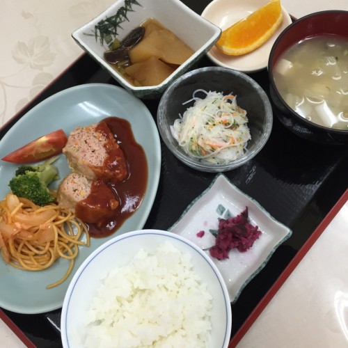 メニューは、ミートローフ、春雨サラダ、大根の煮物、ごはん、味噌汁、漬物、オレンジです!