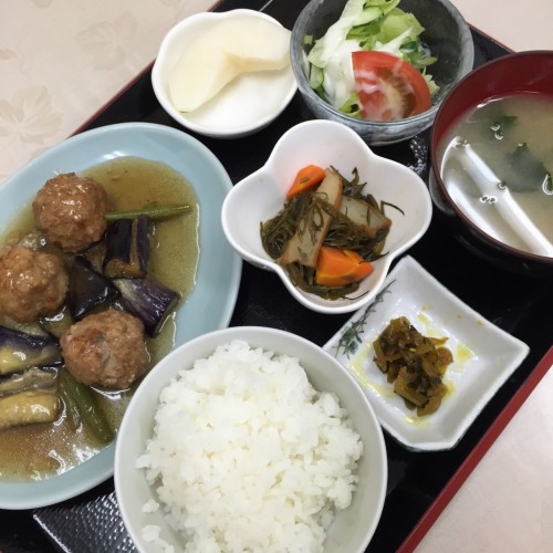 メニューは、なすと肉団子の甘酢あんかけ、サラダ、きざみ昆布の煮物、ごはん、味噌汁、漬物、なしです!