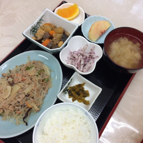 メニューは、春雨の炒め物、大豆の五目煮、大根のゆかり和え、ごはん、味噌汁、漬物、オレンジ、桃です!