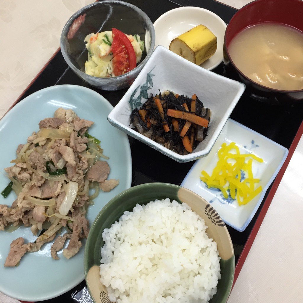 メニューは、豚ニラ炒め、ポテトサラダ、ひじきの煮物、ごはん、味噌汁、漬物、バナナです!