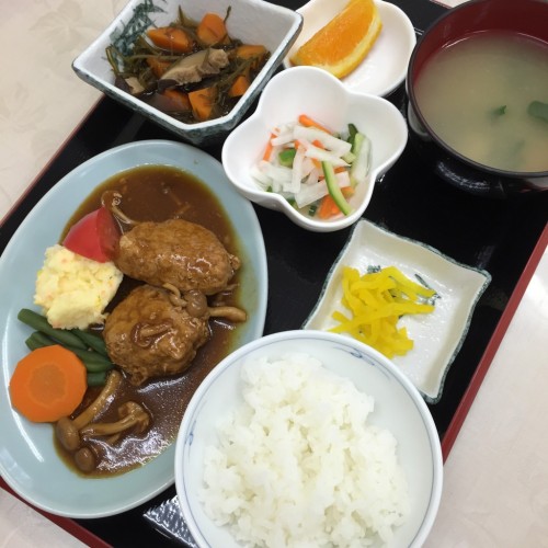 メニューは、煮込みハンバーグ、野菜の酢漬け、刻み昆布の煮物、ごはん、味噌汁、漬物、オレンジです!