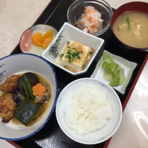 メニューは、鶏団子の煮物、大根なます、あんかけ豆腐、ごはん、味噌汁、漬物、みかんです!