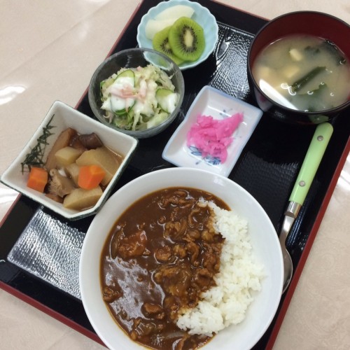 メニューは、ハヤシライス、野菜サラダ、大根の煮物、味噌汁、漬物、キウイ・なしです!