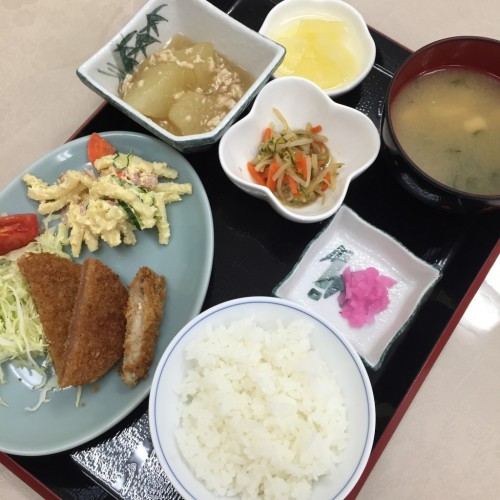 メニューは、ハムカツ、冬瓜のそぼろあんかけ、もやしの和え物、ごはん、味噌汁、漬物、パインです!