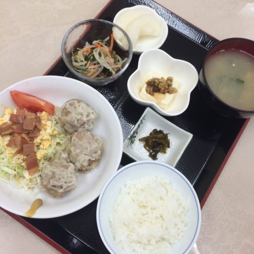 メニューは、シュウマイ、もやしとわかめのナムル、中華風冷奴、ごはん、味噌汁、漬物、なしです!