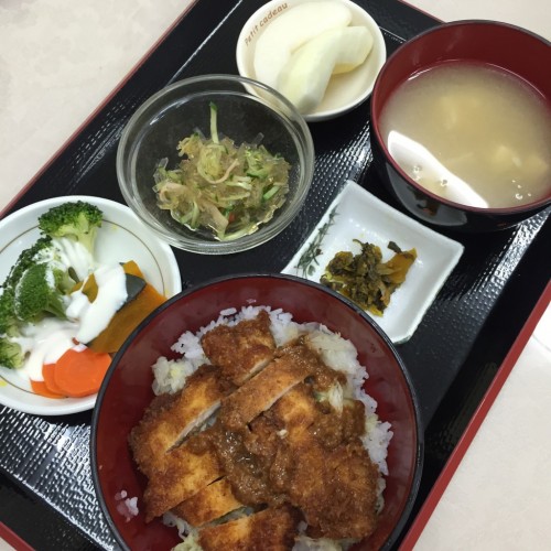 メニューは、ソースカツ丼、温野菜、ところてんサラダ、味噌汁、漬物、りんごです!