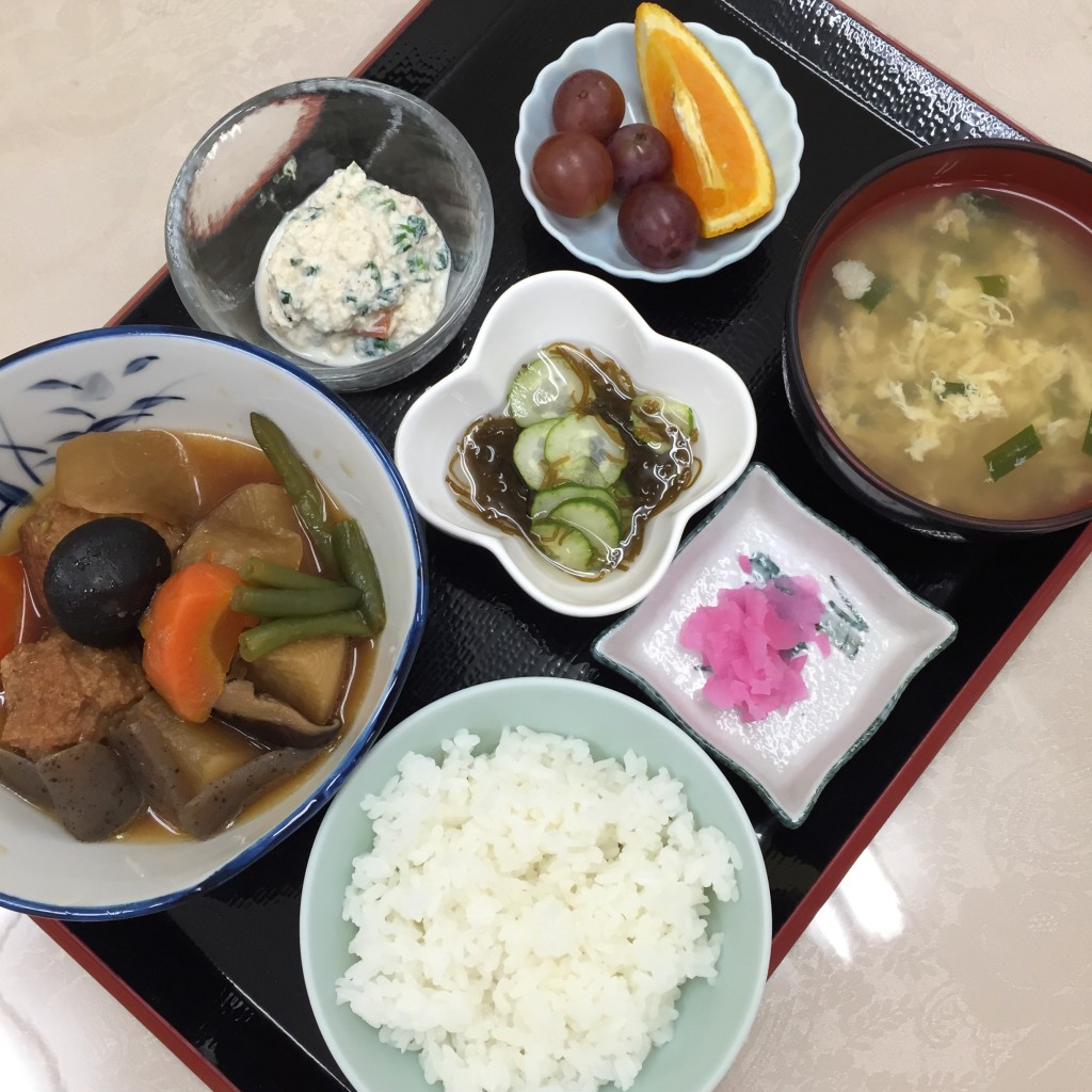 メニューは、大根とつくねの煮物、ほうれん草白和え、もずく酢、ごはん、味噌汁、漬物、オレンジ、ぶどうです!
