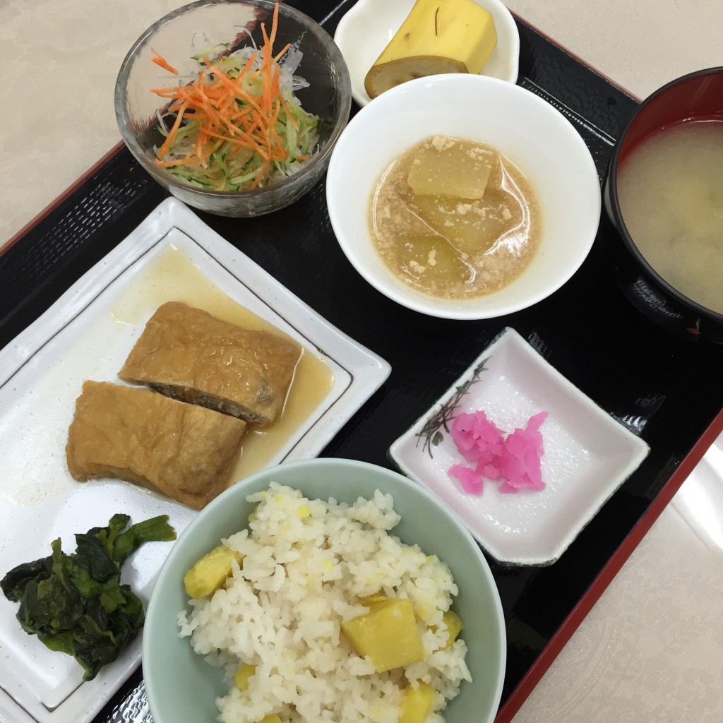 メニューは、油揚げのきんちゃく煮、大根サラダ、冬瓜としいたけの炊き合わせ、ごはん、味噌汁、漬物、バナナです!