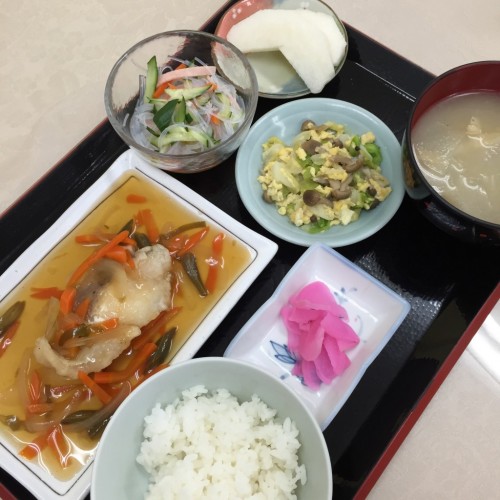 メニューは、たらの甘酢あんかけ、キャベツの卵とじ炒め、春雨の酢の物、ごはん、味噌汁、漬物、なしです!