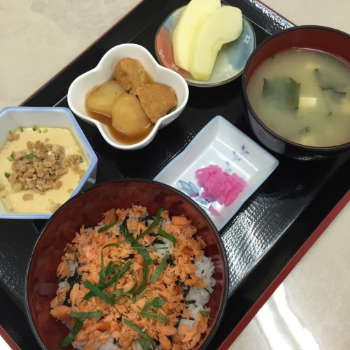 メニューは、鮭丼、じゃがいもと肉団子の煮物、茶碗蒸し、ごはん、味噌汁、漬物、りんごです!