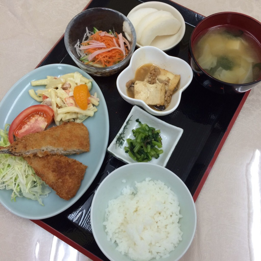メニューは、アジフライ、焼き豆腐の煮物、大根サラダ、ごはん、味噌汁、漬物、なしです!