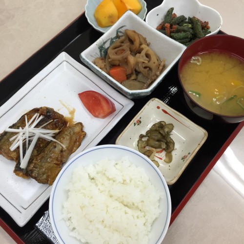 メニューは、さんまの蒲焼、煮物、インゲンの胡麻和え、ごはん、味噌汁、漬物、カキです!