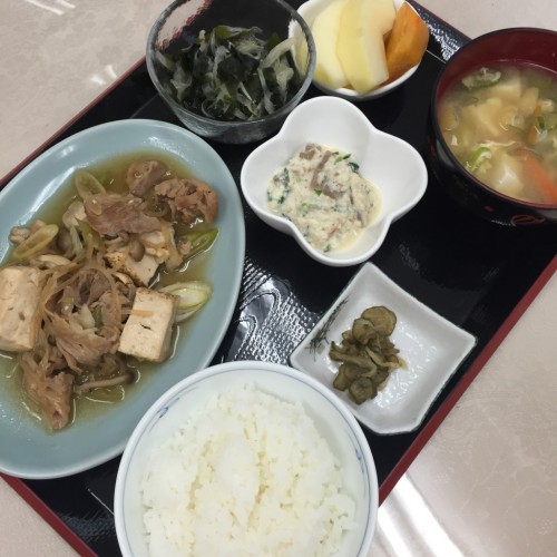 メニューは、すき焼き風煮物、野菜の白和え、ワカメと玉ねぎの和え物、ごはん、味噌汁、漬物、りんご・カキです!