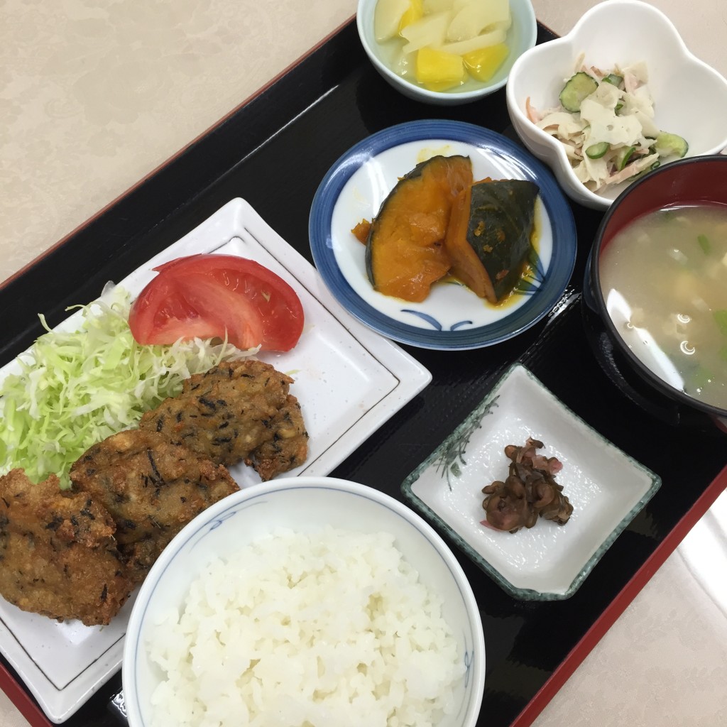 メニューは、ひじきのさつま揚げ、かぼちゃの煮物、れんこんサラダ、ごはん、味噌汁、漬物、ミックスフルーツです!