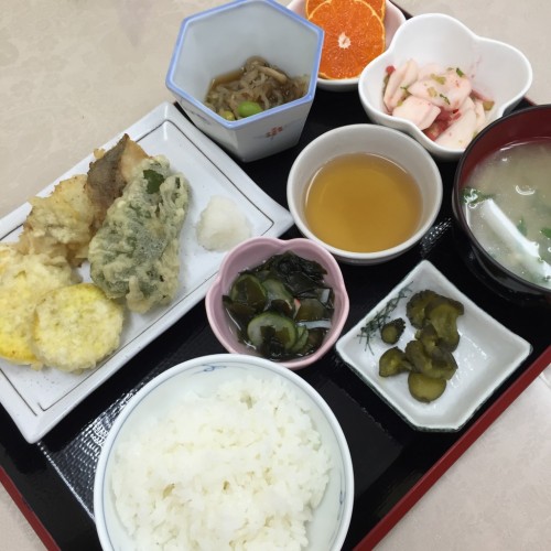 メニューは、たらの天ぷら、しらたきのおかか和え、かぶの梅肉和え、ごはん、味噌汁、漬物、みかんです!