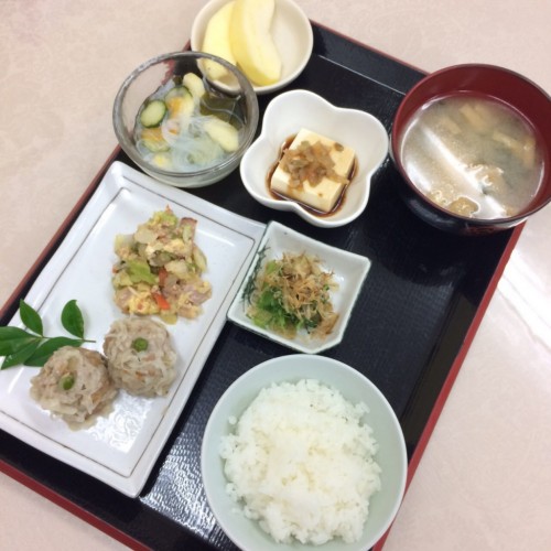 メニューは、シュウマイ、春雨の炒め物、中華風冷奴、ごはん、味噌汁、漬物、りんごです!