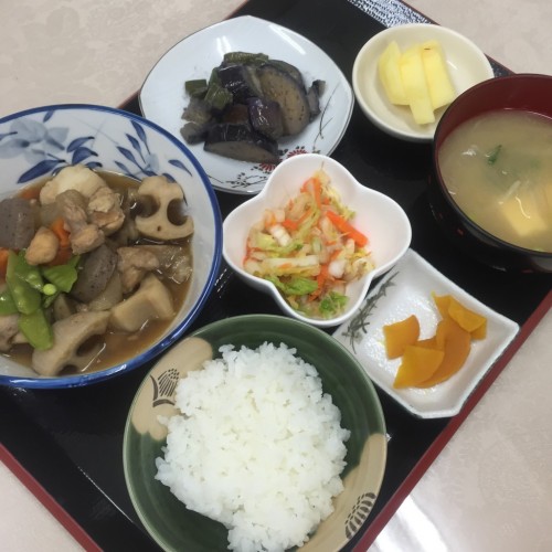 メニューは、筑前煮、なすの炒め物、白菜の和え物、ごはん、味噌汁、漬物、りんごです!