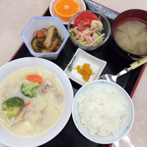 メニューは、シチュー、切り昆布の煮物、野菜サラダ、ごはん、味噌汁、漬物、みかんです!