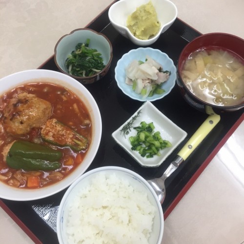 メニューは、肉団子のトマト煮、かぶの炒め物、ほうれん草の和え物、ごはん、味噌汁、漬物、芋きんとんです!